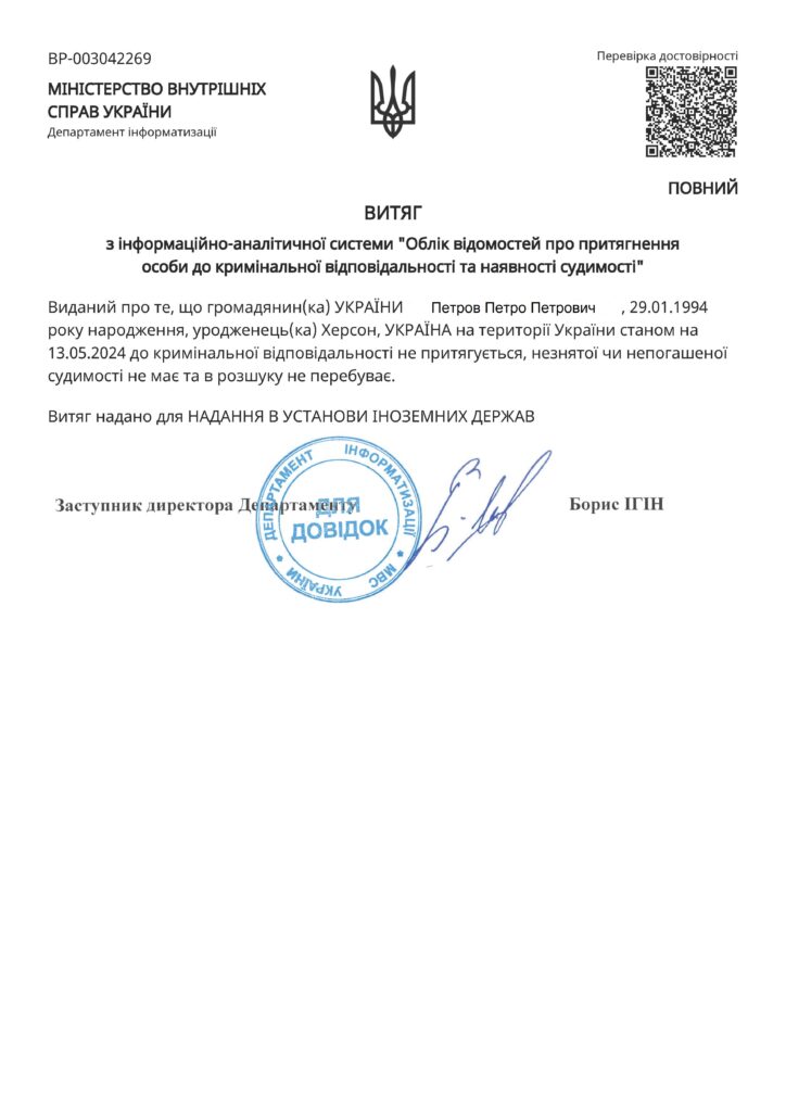 На справках о несудимости, выданных на территории Украины, штамп «Апостиль» проставляет Министерство внутренних дел.