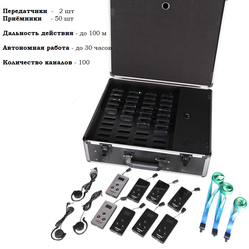 TGS — Это передатчик для переводчика/экскурсовода/лектора и т.п. + приёмники с наушниками для слушателей (до 50 чел.)